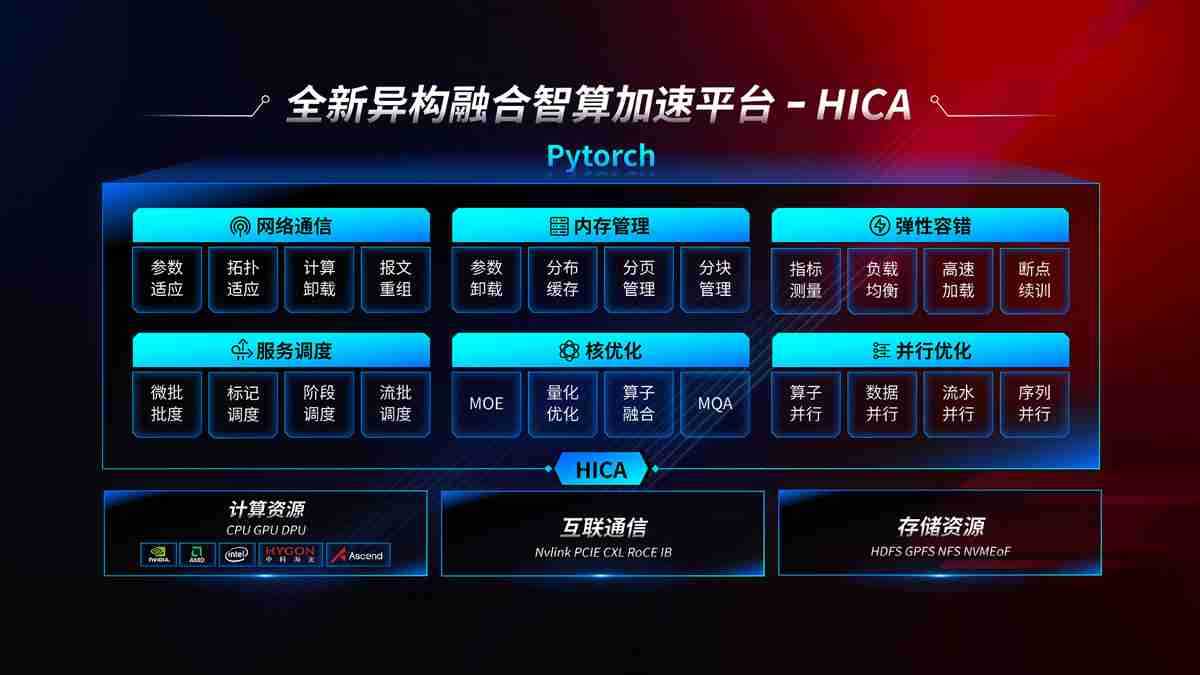通过自研的服务层、、中间适配层、、、以及调度编排算法,,采用数据并行、、、、模型并行等多种并行方式,,,把并行计算任务进行有效的分解,,,,使其分别由相应的软件栈和算力资源来承接。。当GPU资源变化,,,HICA可以实时动态调度计算子任务并调整模型拓扑和架构,,,以充分聚合各种算力资源。。。