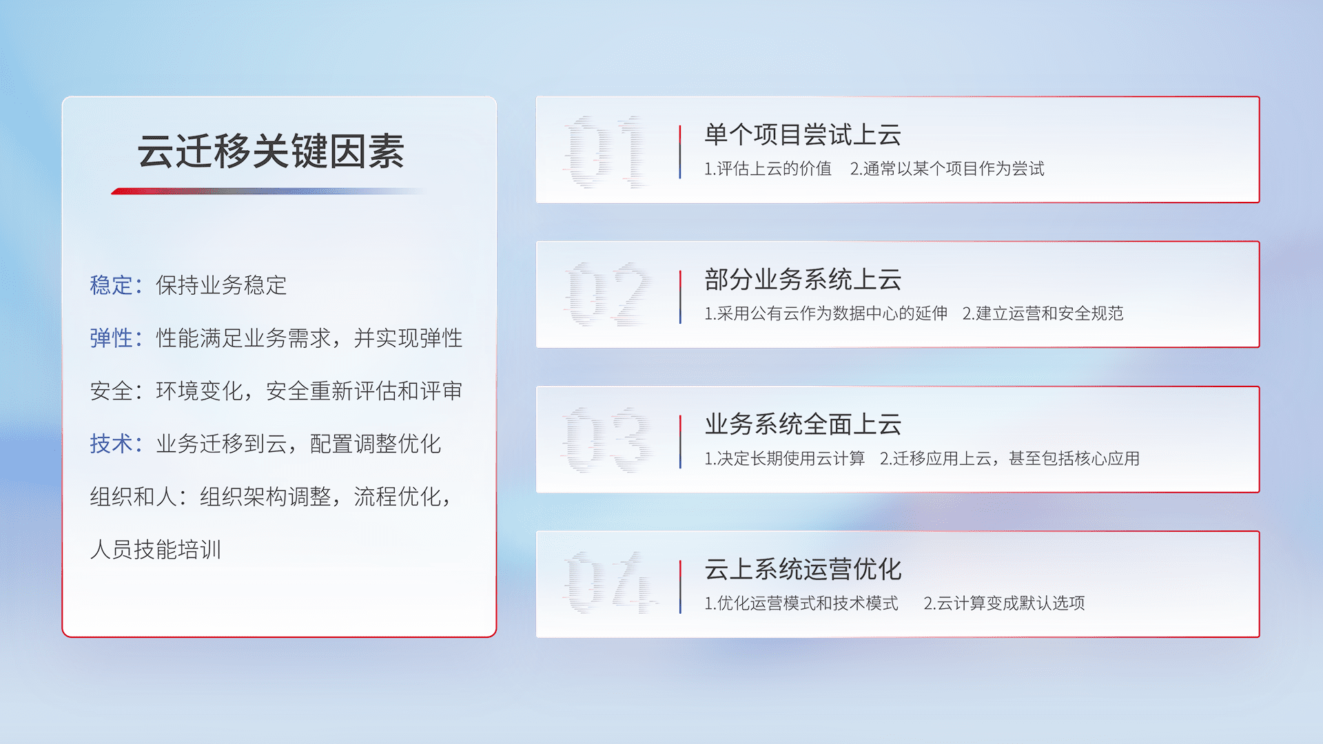 结合实际业务,,从规划设计、、云平台选型、、、云原生改造、、、数据迁移、、、、集成交付,,,迁移全过程为客户识别最佳上云路径,,,做好风险识别管理,,,设计网络架构、、、身份权限、、、、安全审计合规、、、操作审计、、日志审计、、、监控告警策略、、多站点容灾设计等,,对云上基础设施进行整体规划,,,,提升IT治理水平,,,,以满足弹性、、、、高可用、、高性能的需求。。