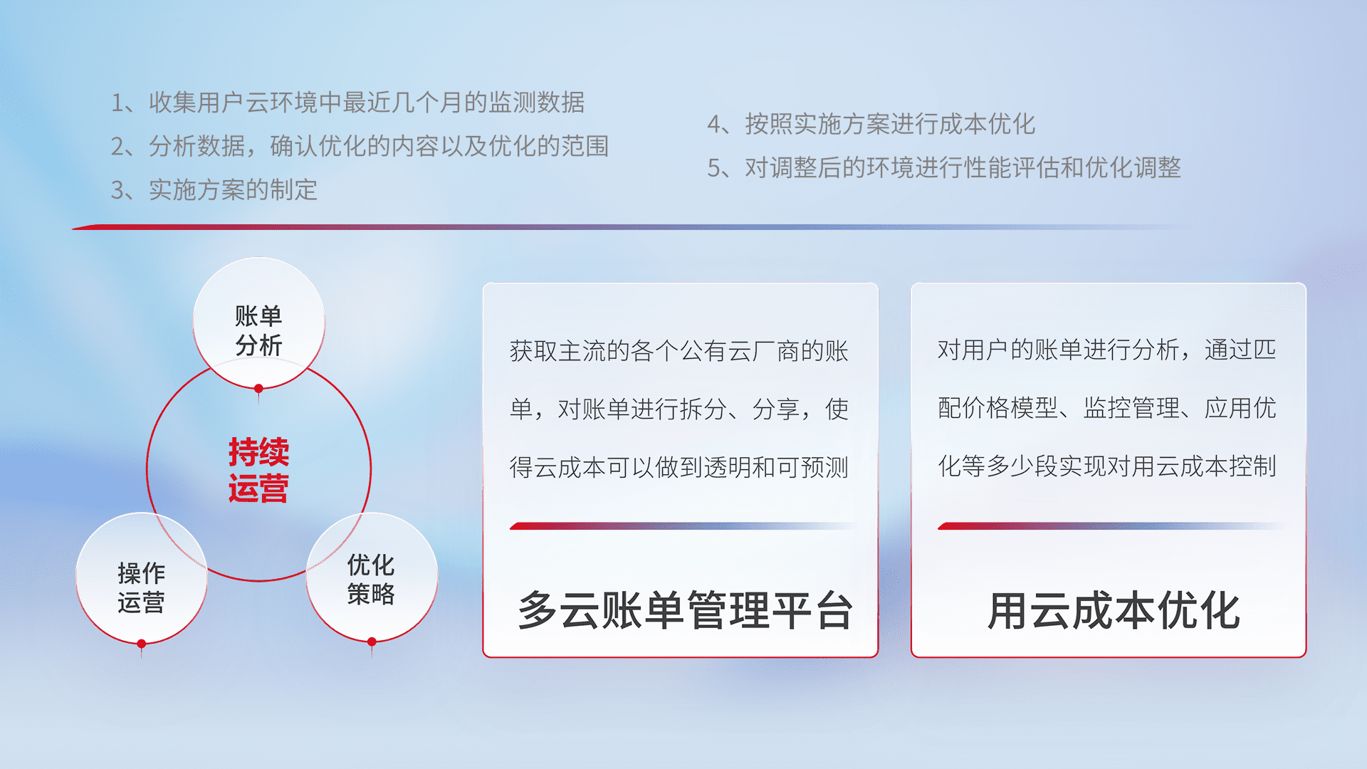 通过灵活运用多种自动化迁移工具,,,,帮助企业用户实现业务和数据高效 、、、稳定的上云迁移和云上迁移,,采用自研多云纳管平台,,以中立管理模式,,,解决多组织、、多云、、多运维厂商的复杂关系的管理,,,保证多云平台资源配置的一致性,,实时掌控云资源运行数据,,运用智能化工具分析云资源多云平台的管理服务,,,,透明化管理成本支出,,用云成本可预测、、用云费用可优化、、、、云资源配额有据可依。。。。